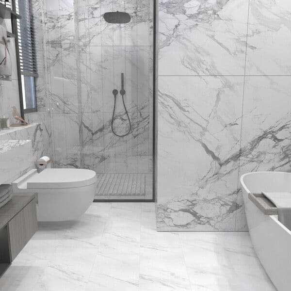 CALI’s Shorebreak collection offers this high-end look with the added benefits of being more comfortable underfoot, easier to clean, and much lighter than real Carrara marble, making tiles simpler to install.