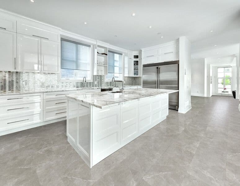 Gray marble laminate flooring is perfect for spaces that require a more neutral yet refined look. Gray tones are incredibly versatile, complementing a wide range of color palettes and interior styles. You might choose gray marble laminate flooring for areas like the kitchen, bathroom, or living room where you want a sophisticated yet understated design. The cool, muted tones of gray can make a room feel more expansive and serene, while still providing the rich, luxurious feel of marble.