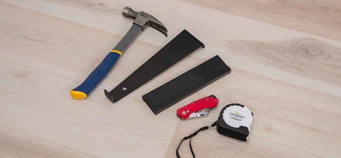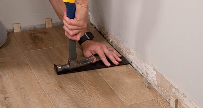 Use a pull bar and a hammer if needed, to assist with engaging the final plank in the row. Insert a spacer to ensure proper expansion space is left. Continue installing the rest of the rows in the same manner.