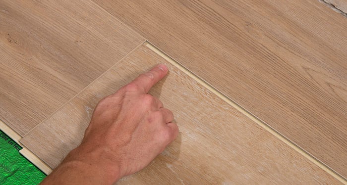 Slightly lift the second plank and push in slightly along the length of the butt seam until the long side is fully engaged. The adjacent plank will also lift. The butt end seam should stay engaged during this action.
