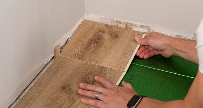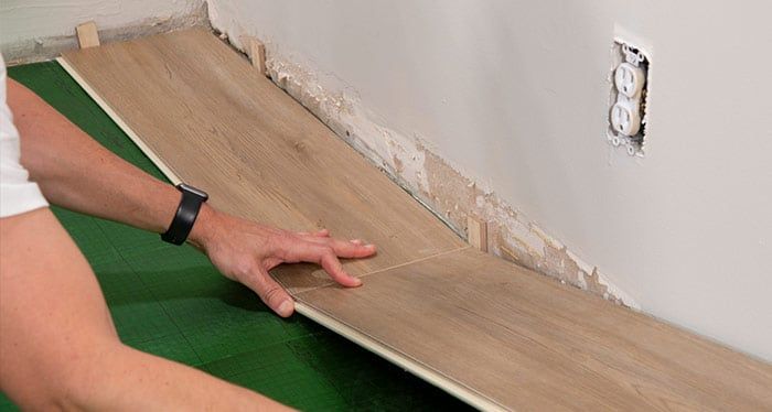 Starting from the left with the tongue-side facing the wall, carefully place the first board in place, using spacers to leave a 3/8” expansion gap between wall and edges of the plank.