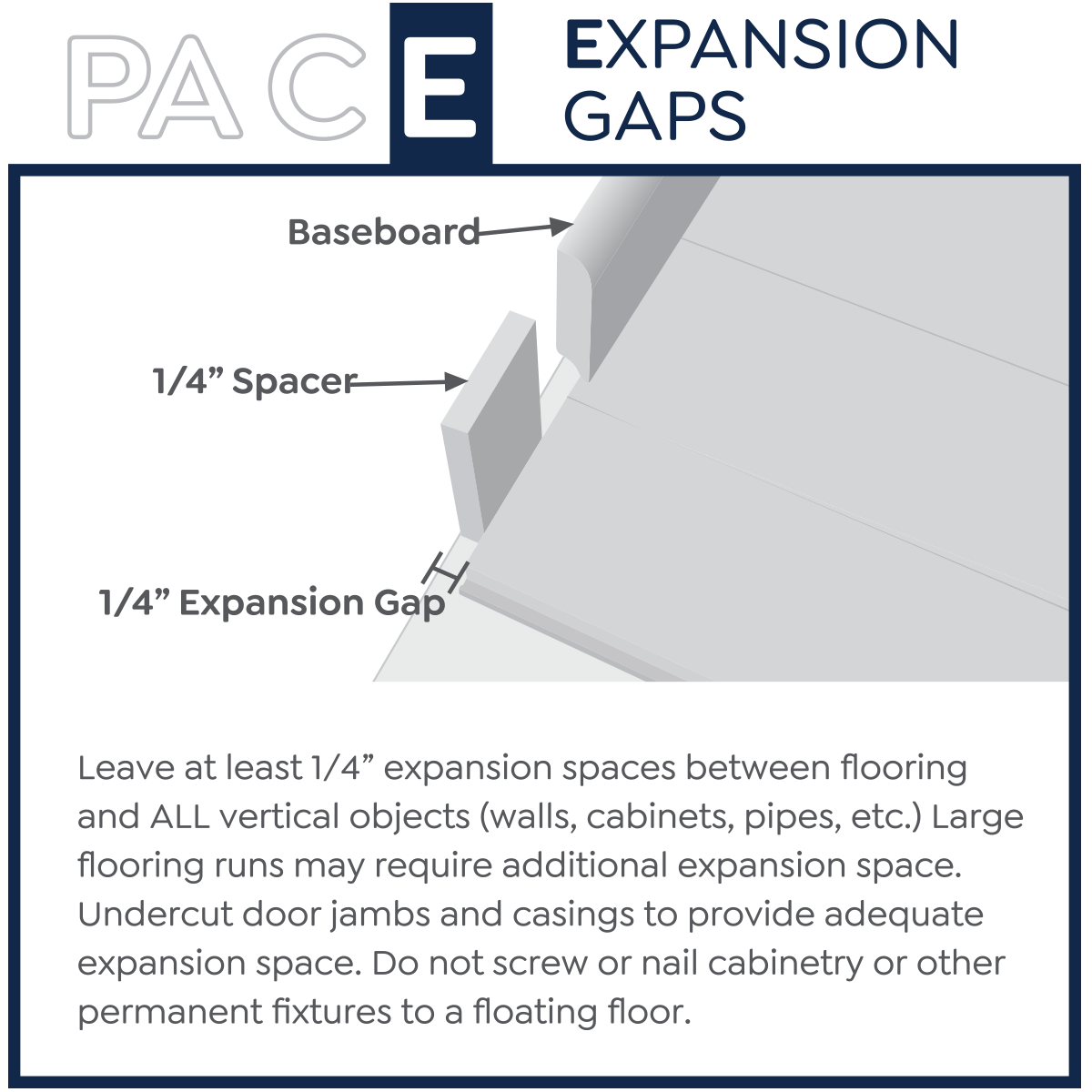 - Never nail or screw anything through a FLOATED floor.