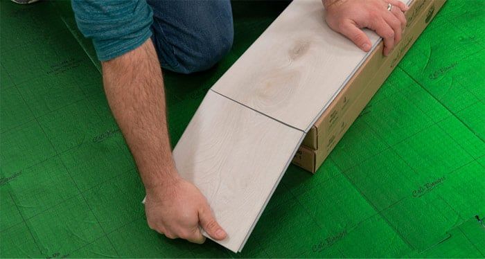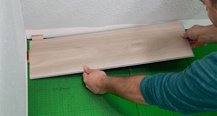 Position the first board in place by angling it up slightly, pushing forward and interlocking the side tongue. The long side of the plank should fit snug with no gapping. Slide this plank towards the butt end seam of your starter plank until the tongue rests near the groove.