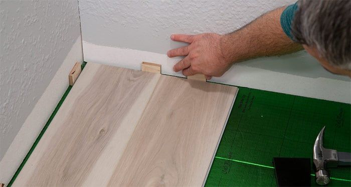 Starting from the left with the tongue-side facing the wall, carefully place the first board in place, using spacers to leave a 1/4” expansion gap between wall and edges of the plank.