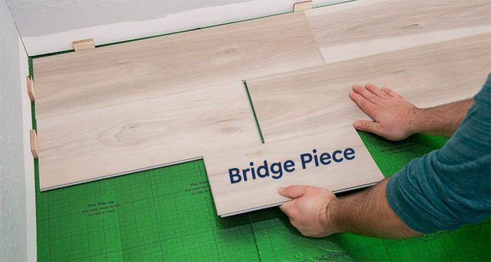 Use a tapping block and hammer at the end of the plank (exposed butt end seam) to engage the ends the planks together. Only tap the top edge of the plank so that you do not damage the clicking mechanism. Remove the bridge piece and continue the row in the same fashion. Using the bridge piece ensures that the butt end seams are properly engaged to prevent any gapping.