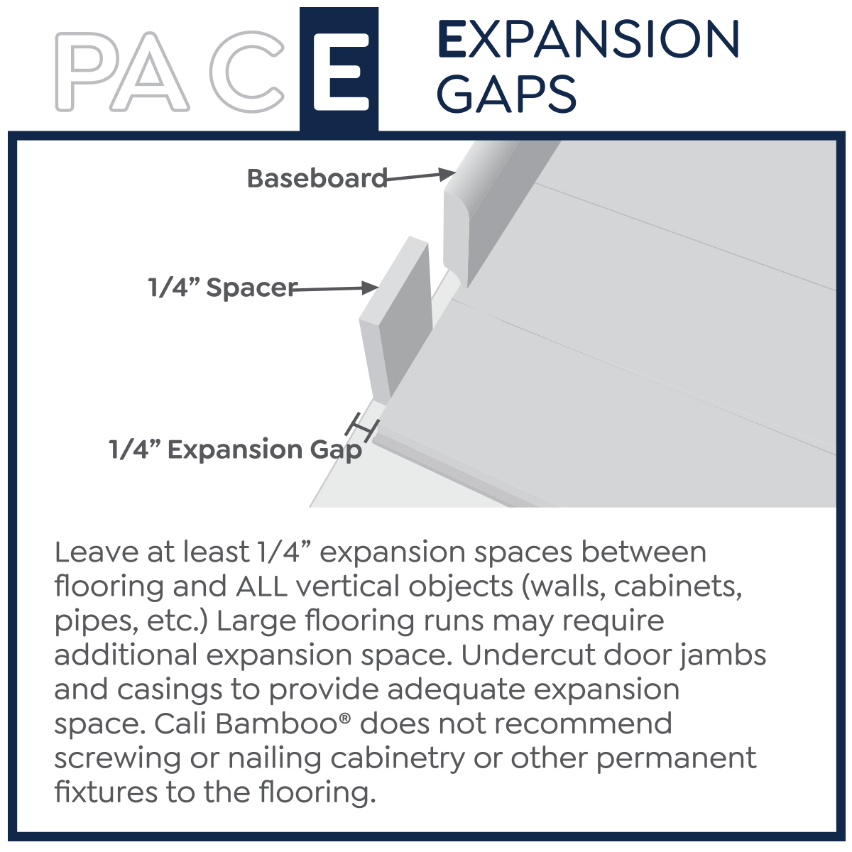 Expansion gaps: Even though CALI bamboo vinyl plank will have very minimal expansion and contraction it is still required to leave 1/4” expansion space around the perimeter as well as all fixed objects (tile, fireplace, cabinets).