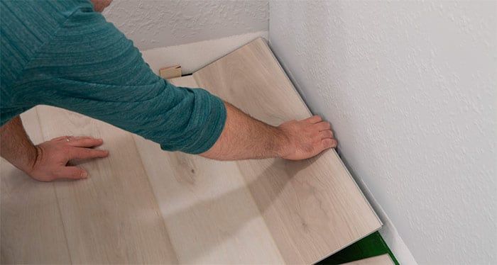 Position the first board in place by angling it up slightly, pushing forward and interlocking the side tongue. The long side of the plank should fit snug with no gapping. Slide this plank towards the butt end seam of your starter plank until the tongue rests on the groove.